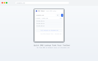 Bu eklenti, temiz ve hafif bir popup arayüz sunar; arka planda herhangi bir işlem yapmaz. Kullanıcı verilerini toplamaz, sorgularınız asla kaydedilmez. Ayrıca, dnsrobot.net üzerinden 53 ücretsiz DNS ve ağ aracıyla tam analiz için tek tıklama ile erişim imkanı sağlar. Geliştiriciler, sistem yöneticileri ve SEO profesyonelleri için ideal bir araçtır.